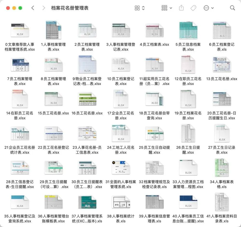 42份员工花名册Excel,部分表格自带公式,可自动生成。自动提醒员工生日、自动提醒合同续签、自助查询员工信息等等。