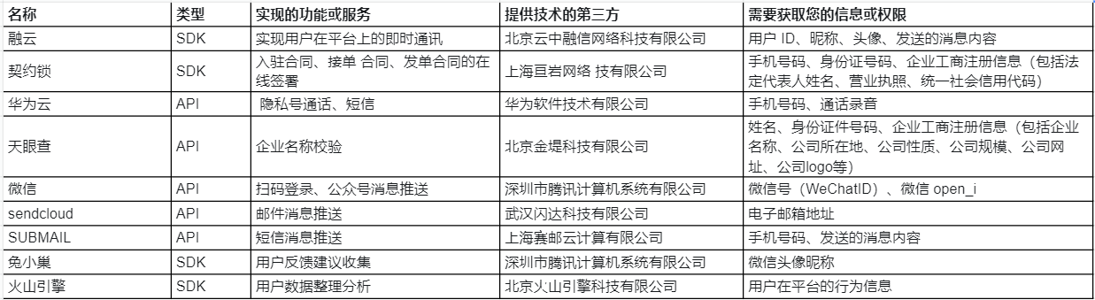 3)为提供和优化我们的服务,我们的服务中内嵌了第三方的SDK,比如:您在求职中需要确定招聘单位的地理位置,可以调用百度地图的定位和导航功能。在您调用相关功能时,第三方SDK可能与我们收集您的个人常用设备信息(硬件序列号、设备MAC 地址、唯一设备识别码)、网络身份标识信息和其他可识别的信息,上述所有信息将去标识化传输。